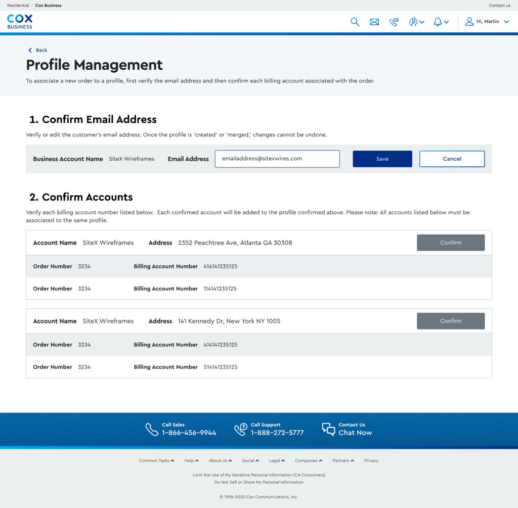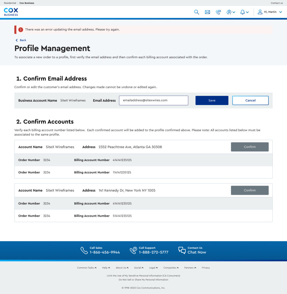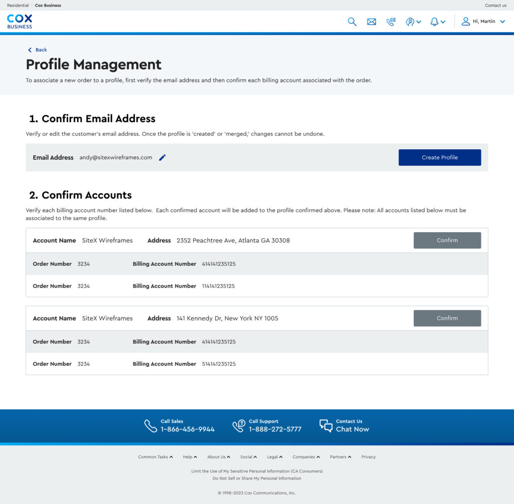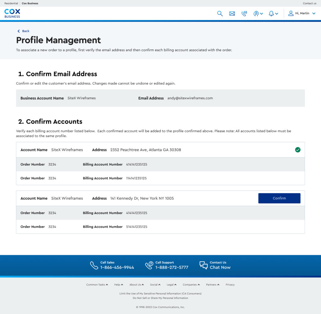 Properly associating the customer with possible accounts (based on order information) also eliminates any confusion the customer might have had during the process, allowing them to immediately log in and start using Cox Business My Account with minimal friction. The designs for this project illustrate the CSR’s two-step process: first, confirming the new customer’s email address, and second, confirming the accounts that will be associated with the customer.